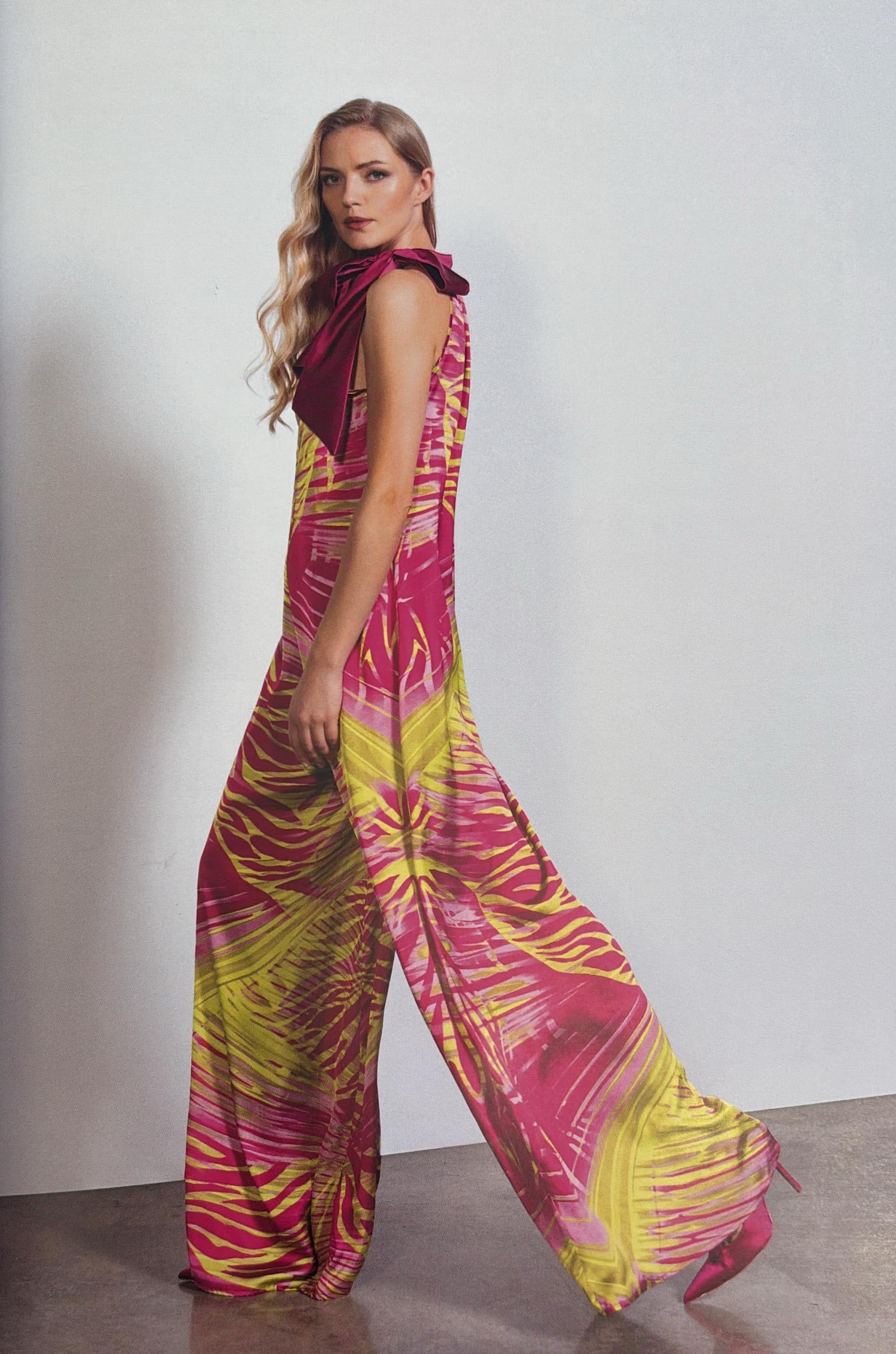 Tuta con scollo americano e leggero scollo a V. Vestibilità molto ampia, pantalone palazzo e largo, dettagli della cintura e del colletto a contrasto, che si chiude con nodo.