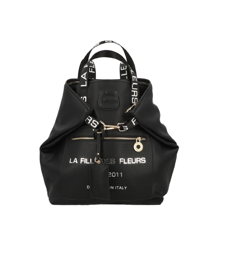 Zaino in pelle con chiusura anteriore con moschettone. Manico con logo, tasca anteriore e logo.